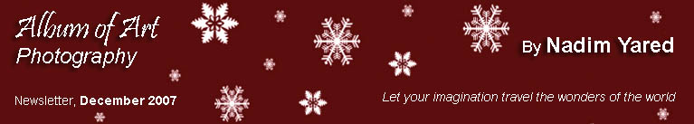 Some survival tips for winter photography: Protect Yourself: As with dressing for any other winter outing, it is best to put on layers, as opposed to one bulky piece of clothing. You can always take off layers if the weather changes. Don’t forget a hat and slim warm gloves. Protect your Camera: Keep your camera dry and warm, you can place it inside your coat. If it is snowing protect the camera with a plastic bag. Use alkaline batteries as they work well in cold weather, and carry a spare set in an inner pocket. Fool your camera: When your camera meter is pointed at a predominantly white snowy scene, the meter "thinks" that it is measuring a very bright scene and recommends an exposure that makes the white snow appear gray. To make the snow appear white, you need to overexpose from the meter reading. The amount of overexposure necessary to do this varies, depending upon the lighting conditions, the type of camera or film that you are using, and just how white you want your snow to look. To learn more about it search “winter photography” on the Internet. http://www.outdooreyes.com/photo18.php3 http://www.kodak.com/US/en/corp/magazine/tips/2001_01/ To view more of Nadim Yared’s collection, visit www.albumofart.com