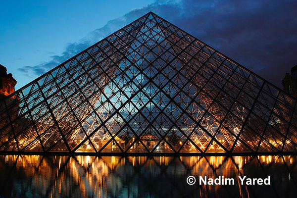 I took this picture in July 2004, on a weeklong trip to Paris. Having lived in Paris for more than a decade, I knew where to head and setup my gear, waiting for the perfect light. One hour after sunset, the sky was turning dark blue, while the sodium yellow lights were abound, creating a contrast between the cool blue and the warm yellow. The reflection on the still water of the surrounding pools adds to the drama, by creating an imaginary reversed Pyramid right in front of your eyes. If you have read the daVinci Code, you will know about the inverted pyramid. It is there, but it cannot be seen from outside the Pyramid.