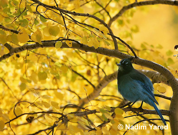 Our first weekend, we headed to Rocky Mountain National Park, about 45 miles north of our home in Colorado. Fall was early that year, some of the Aspen trees started turning bright yellow. We stopped at a picnic area, right under some yellow aspen trees, and as everyone was busy preparing for lunch, I noticed these blue jays that were also interested in our lunch. I grabbed a long lens, decided on a direction to shoot where the yellow foliage, backlit by the noon’s sun, would show up as a totally yellow background for the bird. Blue on yellow is always a pleasing contrast: blue is a cold color, yellow is very warm.