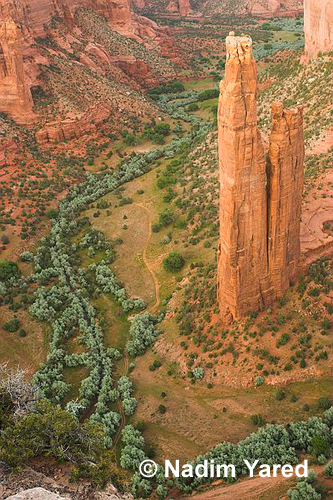 Canyon de Chelley, May 2005. Spider Rock is an interesting rock formation in the canyon: a straight collumn rising over 800 feet high. The local Navajo named it Spider Rock, after one of their most important deity called Spider Woman. It is believed that Spider Woman lived on the top of this rock.